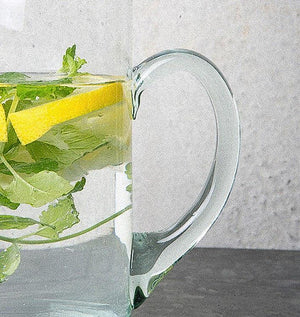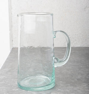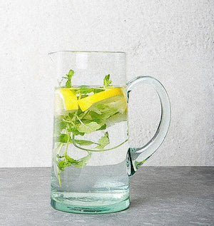 Bevor Sie ein erfrischendes Getränk serviert haben, sind die recycelten Glaswaren der Stadt Naturkultur Tausende von Kilometern zurückgelegt. Hergestellt in der Verre Beldi-Fabrik in Marokko, ist dieser handgefertigte und geblasene Glaskrug sofort an seiner einzigartigen Erleichterung erkennbar.